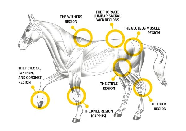2. The fetlock, pastern, and coronet regions, or rather, the interphalangeal joints and metacarpal/metatarsal phalanges.